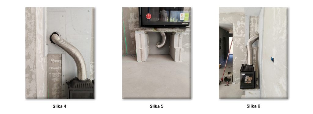 Istovremeno, otvor za dovod spoljašnjeg vazduha je povezan sa kaminom, što omogućava konstantan protok svežeg vazduha spolja iz prostorije i doprinosi optimalnom procesu sagorevanja. Svi priključci su izvedeni precizno i u skladu sa tehničkim preporukama proizvođača, uz upotrebu vatrootpornog silikona i stezaljki na svim spojevima, obezbeđujući dugoročnu i bezbednu upotrebu kamina.
