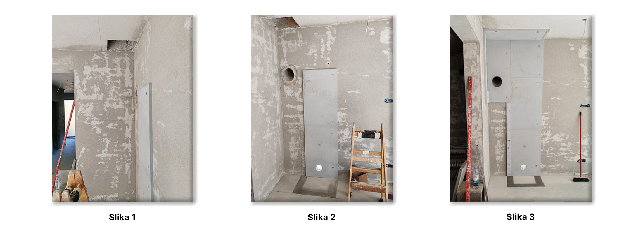 Postojeći otvor u plafonu se zatvara, a budući položaj kamina se precizno obeležava na zidovima, podu i plafonu uz pomoć laserske libele, što obezbeđuje pravilno poravnanje i stabilnost konstrukcije u narednim fazama postavljanja.