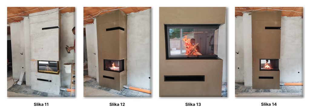 Na oblozi su zatim isečeni otvori za gornju i donju rešetku kamina. Obloga je sada spremna za nanošenje dva sloja lepka i staklokeramičke mrežice. Ventilacione rešetke su postavljene na svoja mesta. Zatim je izvršeno probno paljenje vatre kako bi se videlo da li je sve urađeno ispravno i da li su svi priključci cevi pravilno zaptiveni.