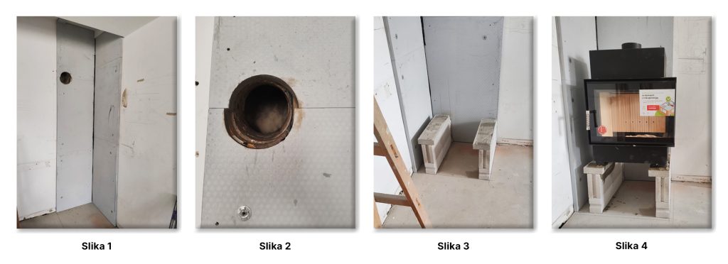 Faza 1: Slike 1,2 – Postavljanje izolacije; Slike 3,4 – Pozicioniranje kamina
