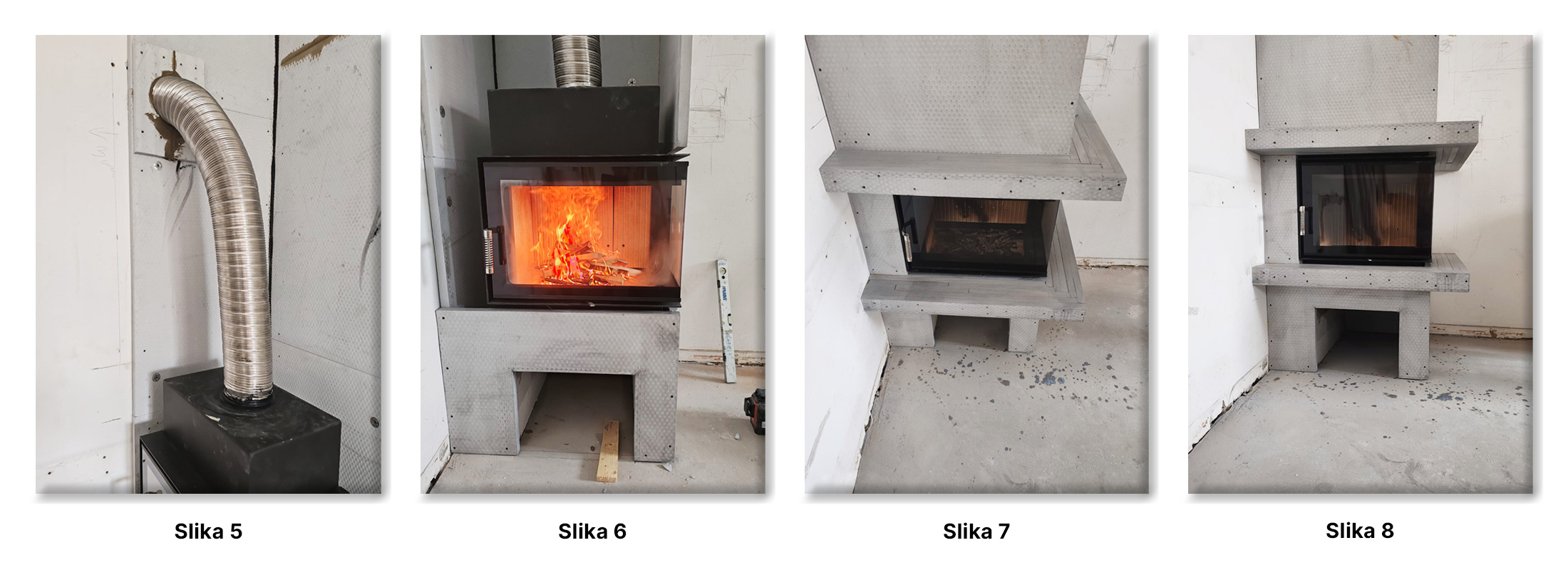 Faza 2: Slika 5 – Spajanje na dimnjak; Slike 6,7,8 – Oblaganje kamina i izrada klupčica