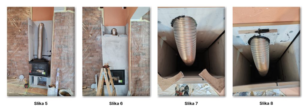 Slike 7 i 8 – Pričvršćivanje dvostruke fleksibilne cevi od nerđajućeg čelika i potpuno zaptivanje svih praznina oko otvora za povezivanje sa budućim dimnjakom vatrootpornim silikonskim i kalcijum-silikatnim pločama, tako da komora bude potpuno zatvorena, kako bi se izbegao gubitak toplote.