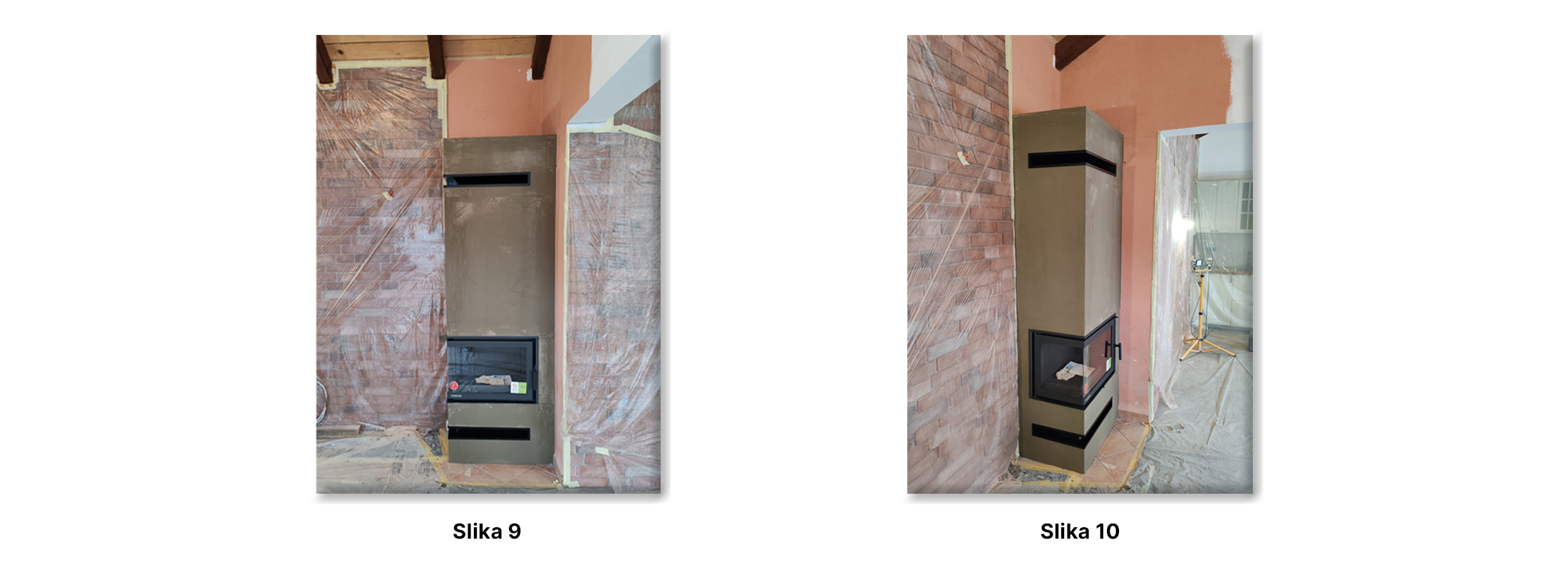 Slike 9 i 10 – Završna siva faza – priprema obloge, nanošenje specijalnog lepka, postavljanje staklokeramičke mrežice i dodatnog sloja lepka za maksimalnu čvrstoću i otpornost, i konačno postavljanje rešetki kamina.