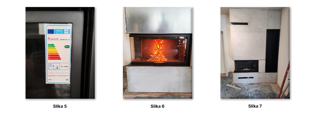 Slika 6 – Nakon što je obloga kalcijum-silikatnih ploča završena i povezana sa sistemom dimovoda preko dvostruko pletene fleksibilne cevi od nerđajućeg čelika, izvršeno je probno loženje. Testiran je ispravan rad kamina – uključujući povratak dimnih gasova, funkcionalnost ventilacije i zaptivanje svih spojeva. Nisu otkrivena odstupanja u radu.