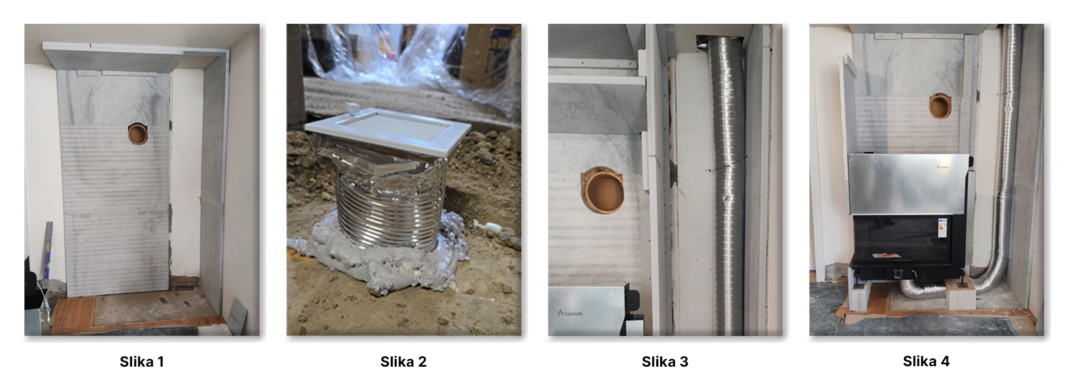 Slike 2 i 3 – U plafonu je izbušen otvor za dovod spoljašnjeg vazduha sa tavana. Dovod je izvršen dvostrukom fleksibilnom cevi od nerđajućeg čelika, koja povezuje kamin sa otvorom na plafonu. Na tavanu, na ulazu cevi, postavljena je zaštitna mreža sa preklopom kako bi se sprečio ulazak prašine ili sitnih životinja u ventilacioni sistem.